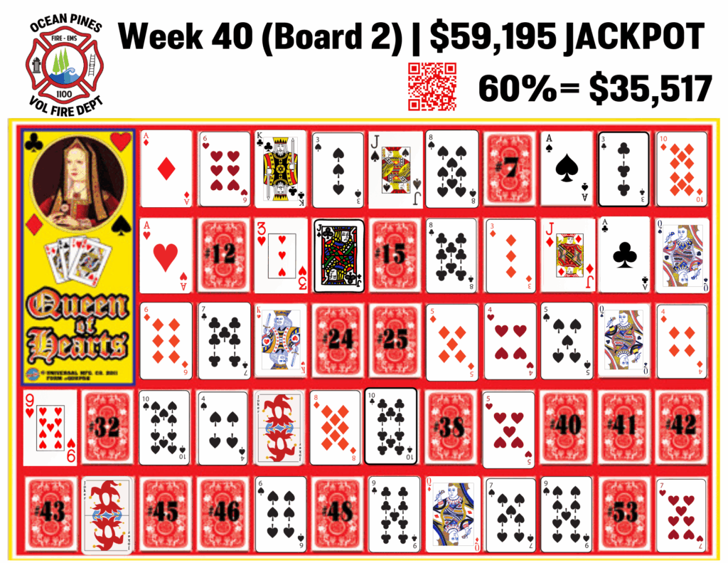 If the winning ticket holder picks the Queen of Hearts, they will receive 60% of the jackpot. The Ocean Pines Volunteer Fire Department will receive the remaining 40%.